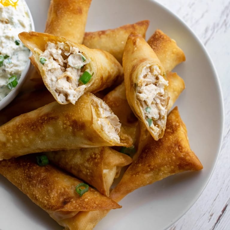Wenn du es schärfer magst, füge ein paar Spritzer Hot Sauce oder eine Prise Chiliflocken in den Dip. Ich habe auch schon Sriracha untergerührt, das passt super. Anstelle von Hähnchen kannst du auch Thunfisch aus der Dose oder vegetarisch einfach mehr Frühlingszwiebeln und Kräuter verwenden. Wenn du keine Lumpia-Teigblätter findest, gehen Wonton-Blätter genauso gut.