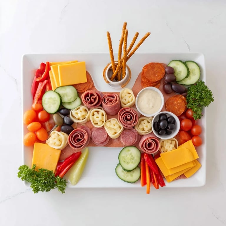 Merken Eine spielerische und interaktive Snackplatte, arrangiert in Form eines Videospiel-Controllers, perfekt für Partys und Spielabende. Diese Platte kombiniert herzhafte Snacks, Käse, Wurstwaren und Dips und erfreut sowohl das Auge als auch den Geschmack.