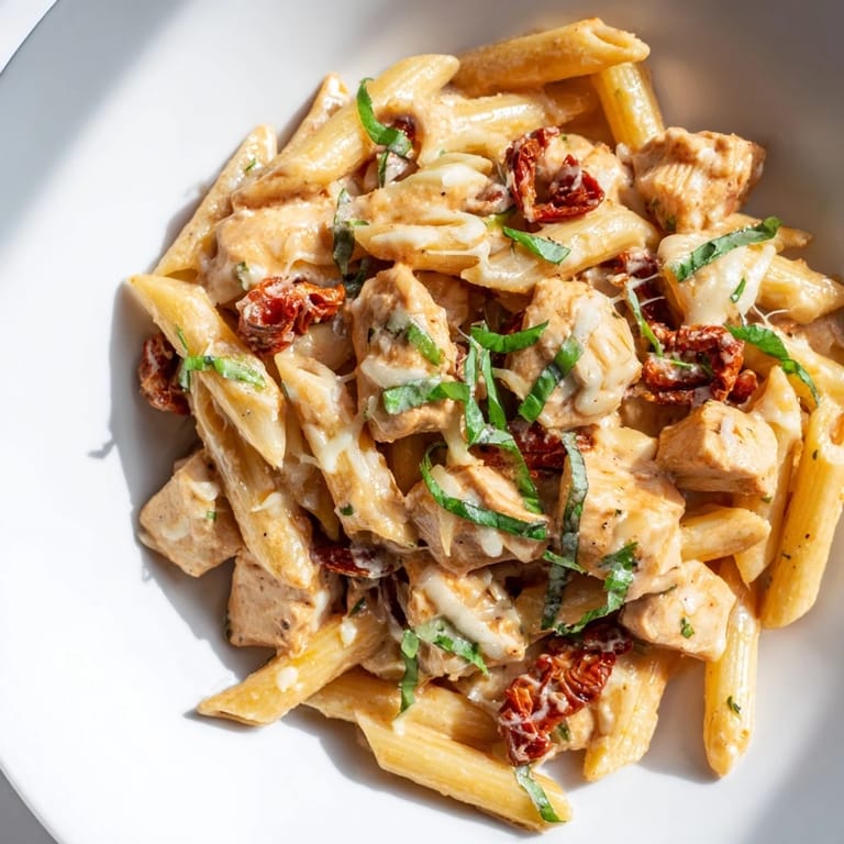 Merken Indulge in the ultimate comfort food with this Creamy Sun-Dried Tomato Chicken Pasta. This luscious dish brings together juicy golden-brown chicken strips, tangy sun-dried tomatoes, and perfectly cooked penne, all wrapped in a rich, garlicky cream sauce that feels like a hug in a bowl. It is the ideal choice for a cozy weeknight dinner or a relaxed evening with friends.