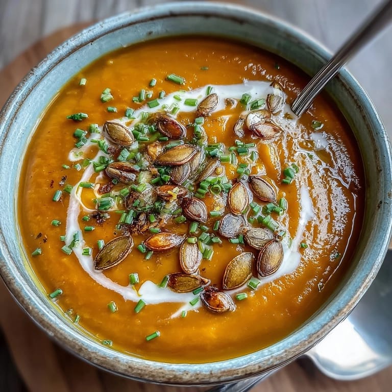 - Fülle die dampfende Suppe in Schalen und streue geröstete Kürbiskerne, gehackte Schnittlauch und einen Klecks Sahne darüber. Der Kontrast zwischen der glatten Suppe und den knusprigen Kernen ist einfach perfekt.