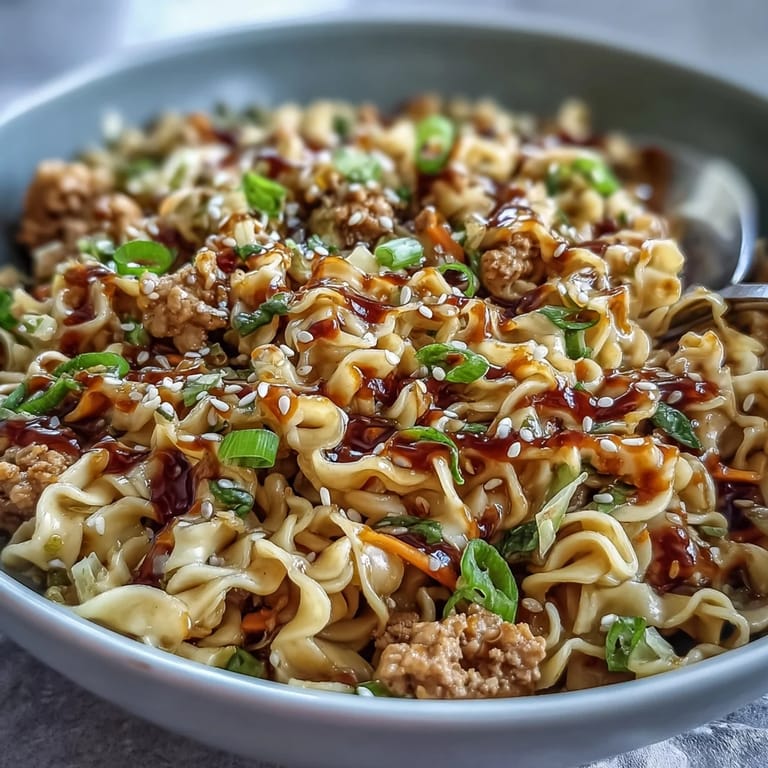 Merken An unexpected weeknight discovery happened when I opened my pantry and found ramen noodles staring back at me alongside a container of coleslaw mix that needed using up. There was ground turkey thawing on the counter, and suddenly the kitchen smelled like possibility instead of obligation. I started whisking together what felt like potsticker flavors—sesame, soy, a touch of peanut butter—and twenty-five minutes later, something magical happened in the skillet. My partner came home to the aroma of caramelized turkey and toasted sesame oil, and that bowl became the meal we both talked about for weeks afterward.