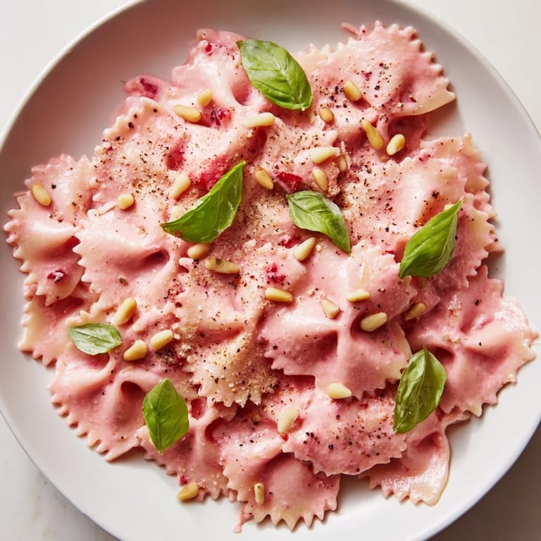 - Verteile die Pasta auf Tellern und garniere sie mit Basilikum optionalen Pinienkernen und zusätzlichen Erdbeerscheiben. Serviere sofort.