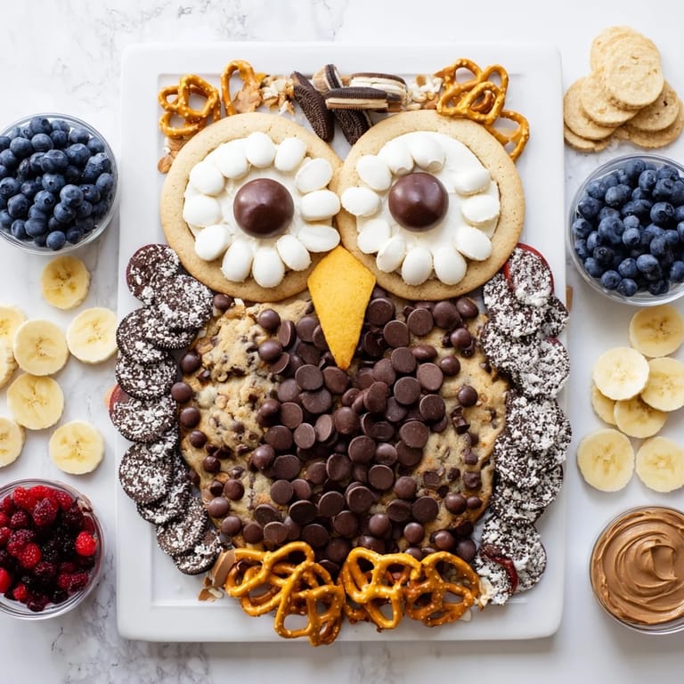 Merken Ein verspieltes Dessertbrett, inspiriert von den bezaubernden Geräuschen der Nacht, mit einer Auswahl an Süßigkeiten und Leckereien, die kreativ zu einer weisen Eule arrangiert sind. Perfekt für Partys, Familientreffen oder Themenveranstaltungen.
