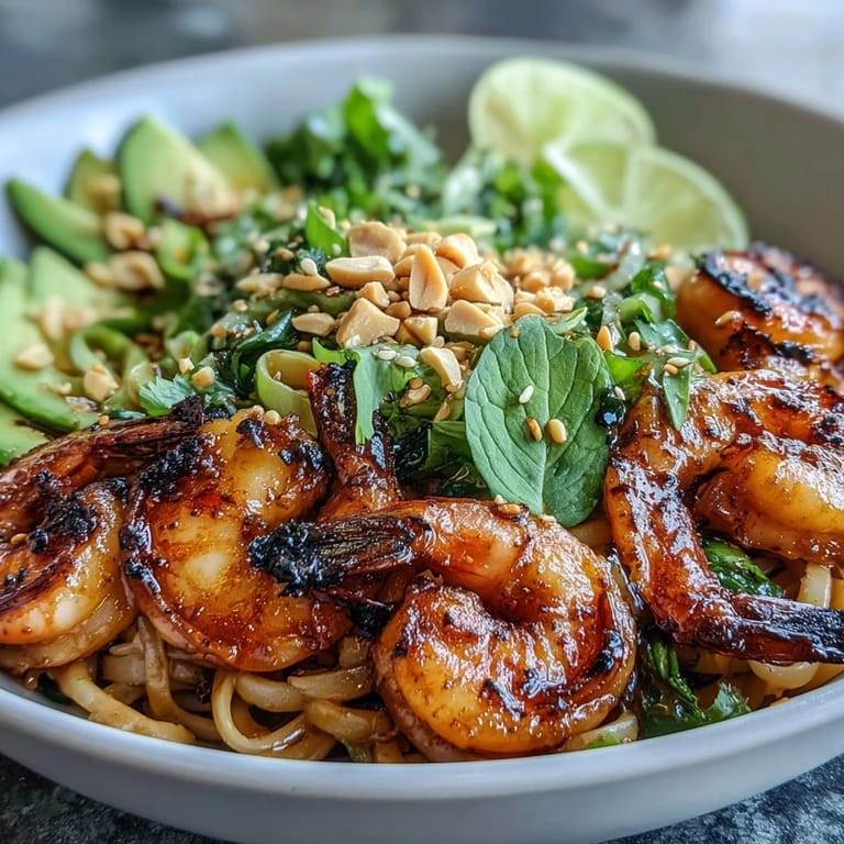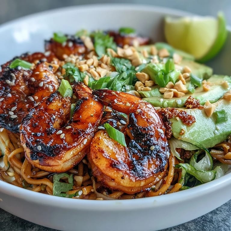 Merken This Grilled Shrimp Asian Noodle Bowl is a vibrant and refreshing dish that perfectly captures the essence of smoky, savory, and fresh flavors. Featuring tender grilled shrimp nestled on a bed of sesame-infused egg noodles, it is beautifully complemented by the crunch of cucumber, the creaminess of avocado, and the nutty finish of roasted peanuts. It is an ideal meal for those seeking a balanced, protein-packed bowl with an Asian-inspired flair.