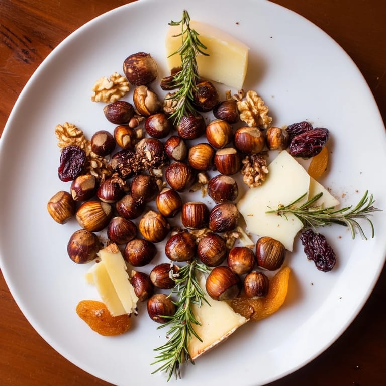 - Platter: 1/2 Tasse geröstete Haselnüsse, 1/2 Tasse geröstete Walnüsse, 1/2 Tasse getrocknete Cranberries, 1/2 Tasse getrocknete Aprikosen (halbiert), 1/2 Tasse kernlose rote Trauben, 1/4 Tasse Kürbiskerne, 100 g gereifter Cheddar (gewürfelt), 100 g Brie oder Camembert (in Scheiben), 1 kleiner Apfel (entkernt und geschnitten), 1 EL frische Rosmarinzweige (zur Garnitur)