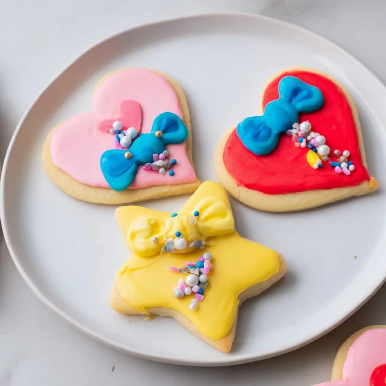 Merken Süße Zuckerplätzchen in Herz- und Sternform, dekoriert mit buntem Zuckerguss und charmanten Schleifendesigns—perfekt für Feierlichkeiten, Geschenke oder den Nachmittagstee.