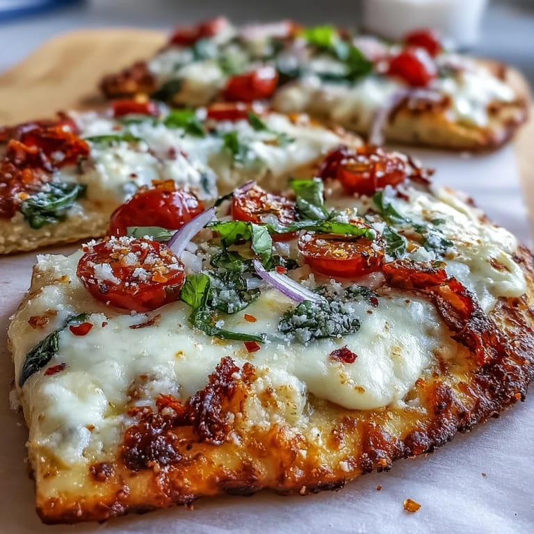 Diese Pizzas sind schnell genug für einen Wochentag-Abendessen, aber gut genug, um sie für Gäste zu machen. Ich serviere sie mit einem Glas Sauvignon Blanc oder eines leichten Rotweins—etwas, das der Richness des Käses nicht konkurriert. Wenn du ein paar von diesen für später machen möchtest, sie reheaten okay, aber wirklich, sie sind am besten frisch aus dem Ofen, noch warm und mit diesem Knoblauch-Aroma, das deinen ganzen Mund ausfüllt.