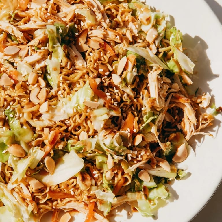 Merken This Crunchy Ramen Chicken Salad is a vibrant American-Asian fusion dish that brings together a medley of textures and bold flavors. It is the ultimate quick meal, combining pre-cooked rotisserie chicken with fresh vegetables and a signature crunch from instant ramen noodles, all tossed in a sweet and savory sesame dressing.