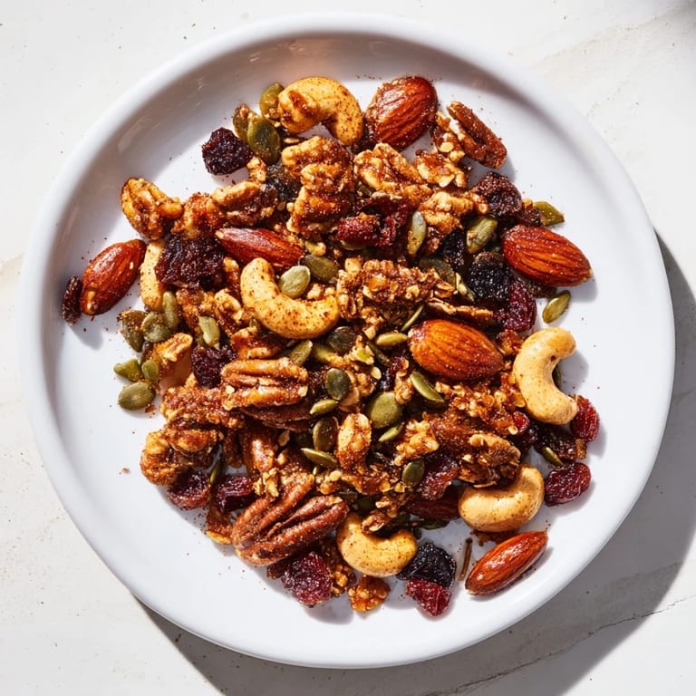 Merken Eine knusprige, gesunde Snackmischung mit gerösteten Nüssen, Samen, getrockneten Früchten und einem Hauch von Gewürzen—perfekt für einen Energieschub oder zum Teilen bei Zusammenkünften.