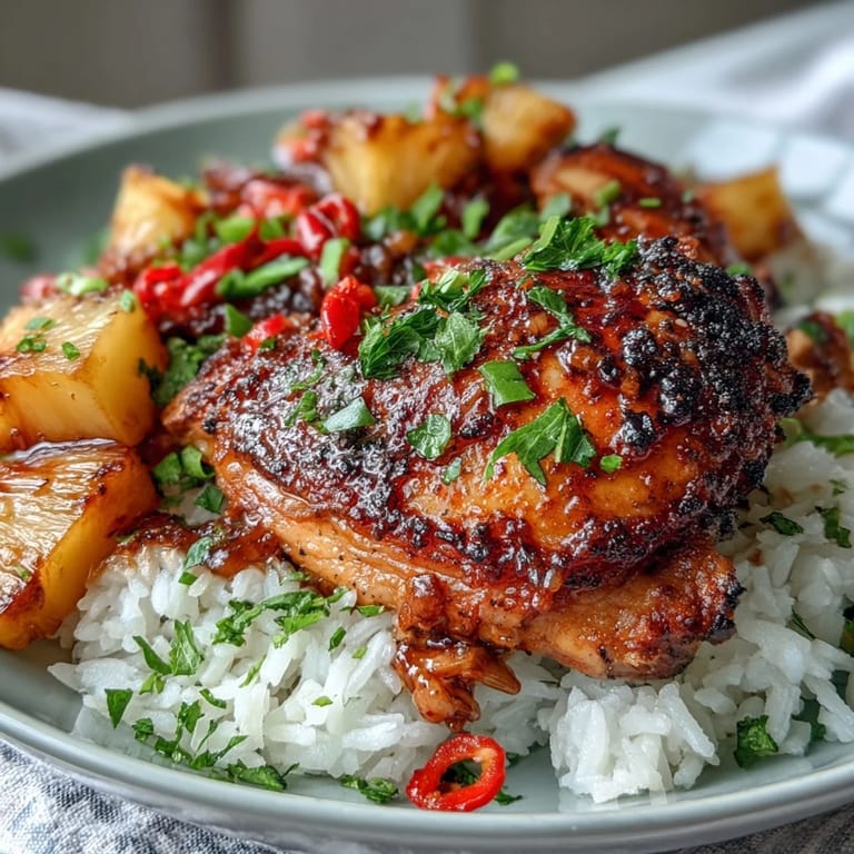 For even more flavor, consider marinating the chicken thighs in a mixture of soy sauce and pineapple juice for 30 minutes before cooking. This step infuses the meat with tropical sweetness and savory depth. Make sure to rinse your rice thoroughly before cooking—this removes excess starch and helps achieve fluffy, separate grains. If you prefer a spicier kick, increase the chili flakes or add a dash of sriracha to the broth. Using an oven-safe skillet with a tight-fitting lid ensures the steam stays trapped, creating perfectly cooked rice every time.