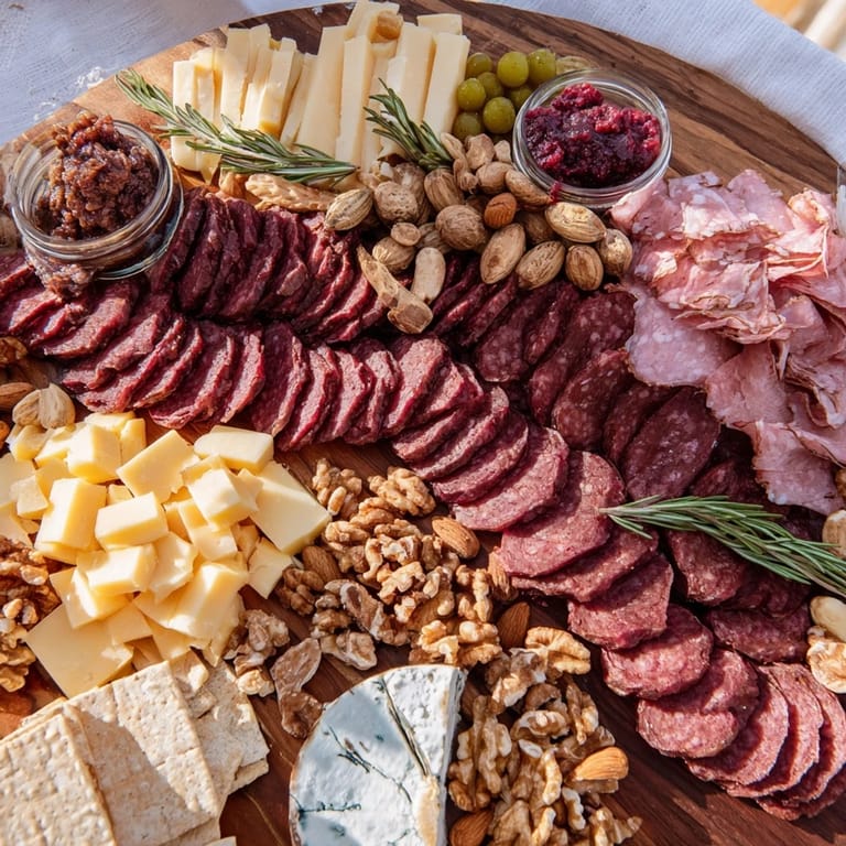 - Wildfleisch: 120 g Hirschsalami, dünn geschnitten, 120 g geräucherte Elchwurst, in Scheiben, 100 g Wildschweinprosciutto, in Stücke zerrissen